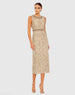 Chic sequined midi sheath dress featuring a dramatic jewel-embellished collar and a jewel-embellished belted waist. Midi-length skirt features a back vent slit.