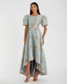 Stunning brocade gown featuring short puff sleeves and a high low hem. Perfect for any spring forward special occasion event.