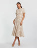 This charming dress is crafted from boucle fabric, offering a textured and sophisticated look. The flattering A-line silhouette pairs beautifully with the high neckline and short sleeves, creating a timeless, elegant style. Frill detailing adds a playful touch, making this dress perfect for daytime events, brunches, or casual outings.