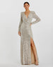 Long sleeve sequined gown with, v-neckline, long sleeves, ruched bodice, and a thigh-high slit.