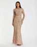 Designed to elongate your figure, this gorgeous long-sleeved gown features a semi-sheer bodice and sleeves, allover diagonal beading, and a delicate hand-beaded belted waist.