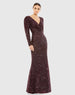 Look radiant at your next event in this sequin-stitched column gown. The demure design is styled with a pleated surplice neckline, long sleeves with puff shoulders, a hand-beaded waist, and a sweep train. It’s a gorgeous show-stopping choice for your next formal event.
