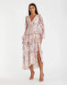 This elegant midi dress features long chiffon sleeves and a thigh-high slit, enhanced by tiered ruffle accents. Crafted from floral-printed chiffon and fully lined for comfort, it showcases a V-neckline with a wrapped bodice design. The semi-sheer sleeves and back zipper complete the refined look. This pretty floral dress embodies romantic sophisticated charm.