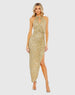 Stunning sequin dress with a high neckline, keyhole detailing, and an asymmetrical hem.