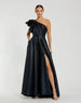 One-shoulder metallic brocade ballgown accented with a thigh-high slit and pockets.