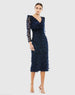 This midi dress features a flattering v-neckline and elegant long illusion sleeves. The embellished fabric adds a touch of glamour, perfect for formal events or special occasions.