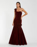 Sophisticated and striking, this velvet gown features a one-shoulder neckline with dimensional floral appliqué. The curve-hugging mermaid silhouette flares into a dramatic trumpet hem, perfect for black-tie events and formal evenings.