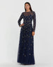 Step into celestial glamour in this elegant Mac Duggal evening gown, showcasing a sheer illusion neckline, starburst silver beading, and a flowing A-line skirt. Perfect for black-tie events, galas, and red carpet moments.