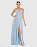 Elegant A-line gown accented with a plunging neckline and intricate bead-and-rhinestone floral accents across the shoulders and upper back.