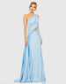 Sophisticated and sleek, this charmeuse gown features an asymmetrical one-shoulder neckline, rhinestone-embellished waist cutout, a floor-length column silhouette, and a cascading train; perfect for evening occasions.